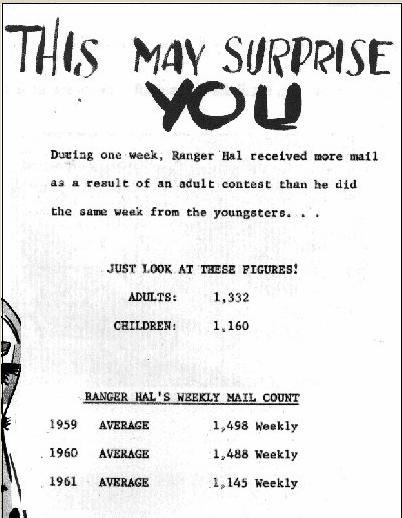 Left: "This may surprise you. During one week, Ranger Hal received more mail as a result of an adult contest than he did the same week from the youngsters...